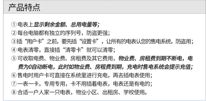 主要特點:應(yīng)用計算機管理,先購電后用電;在額定電流范圍內(nèi)能限制使用功率(由供電部門限定);一表一卡,專卡專用,失卡不失電,補卡再用;電卡能雙向傳遞數(shù)據(jù),能自動斷電告警用戶購電;電量為零時,自動拉閘斷電;并具有一定的防竊電軟件設(shè)計等。